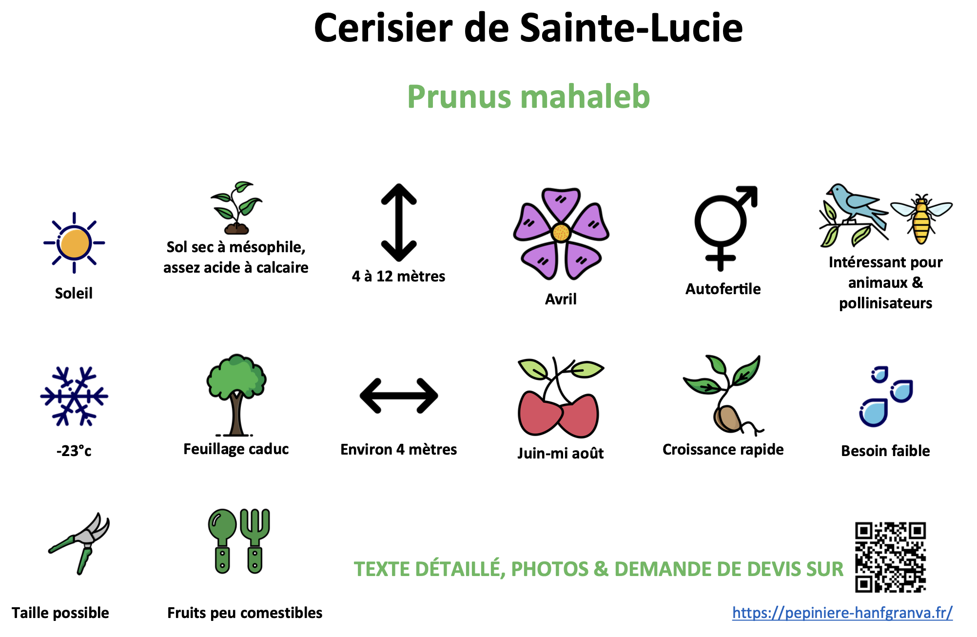 Entomophile et mellifère, pour les insectes et pour l’apiculture, je suis autofertile et présente en avril une multitude de fleurs blanches, avant d’offrir aux oiseaux, de juin à mi-août, mes petites cerises rouge foncé, puis noires. Elles sont peu comestibles, car très acides et amères, et servent néanmoins traditionnellement à produire de l’eau de vie. Mes fleurs sont utilisées en macération avec différents alcools et vins.