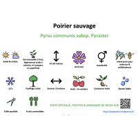 Entomophile et mellifère, pour les insectes et pour l’apiculture, je suis autofertile et présente en avril-mai mes fleurs, avant d’offrir aux animaux et gastronomes, d’août à mi-octobre, mes petits fruits, des poires sauvages comestibles si blet, crues ou en compote.